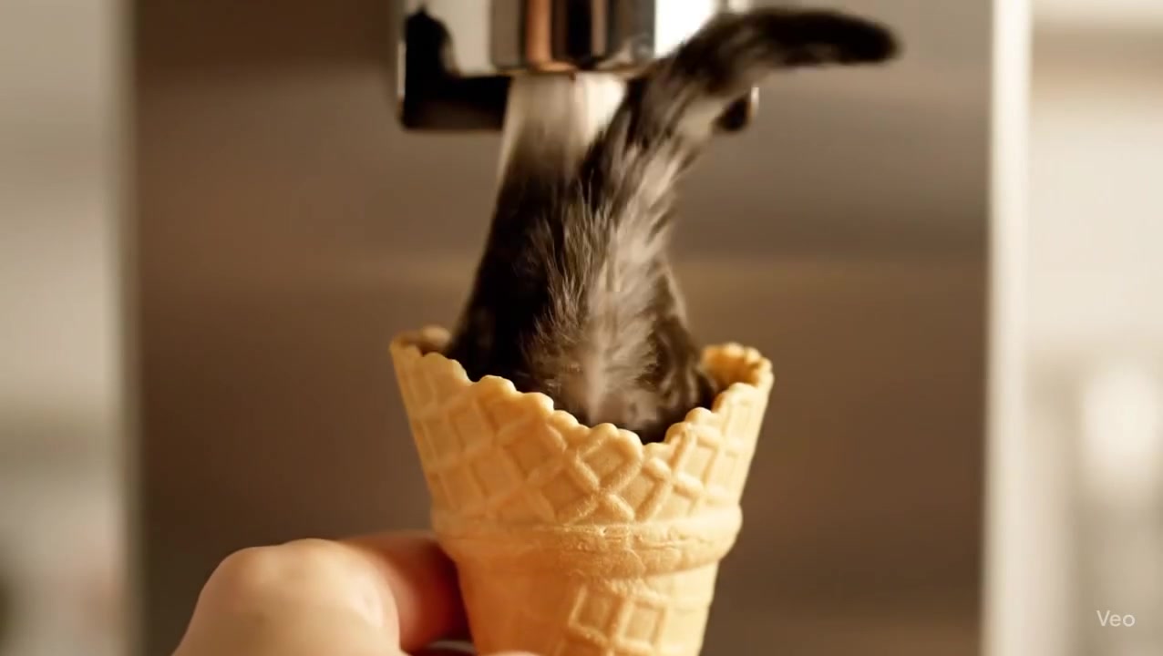“first-person pov, a woman’s hand holds a waffle cone under a soft-serve machine, a tiny [animal] slowly emerges tail-first as if being dispensed like ice cream, forming fully in the cone and then placing its paws/limbs on the edge, leaning toward the camera with a cute curious expression, realistic textures, cinematic detail”