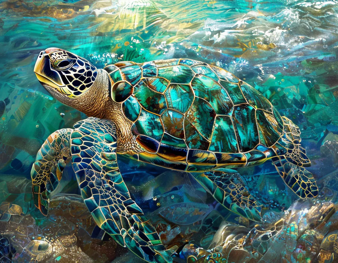 A sea turtle gliding through turquoise water, its shell made of intricate mosaic tiles in shades of emerald, sapphire, and gold. Sunlight filters through the waves, scattering jewel-like reflections across the ocean floor. Rendered in decorative mosaic style with rich texture and luminous detail.