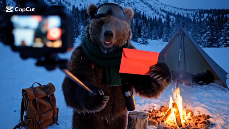 Bear pulls red envelope from log, shows it to camera, opens it to reveal paper with gothic writing. Squints at it, then looks to camera with mock-exasperation, breaking into a wide grin, holding letter toward lens.