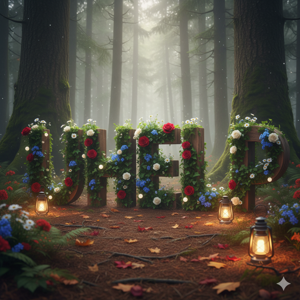 Enchanted forest scene with large wooden letters "UHELP" adorned with greenery and colorful flowers, positioned in the center and right of the frame. The letters are embellished with red and white flowers, small white ornaments, and trailing vines. The forest floor is covered with brown pine needles and scattered leaves, with small glowing lanterns placed around the letters, casting warm light.