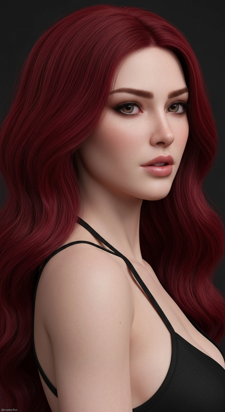 A breathtakingly hyper-realistic, 8K cinematic photograph captures a stunning woman in a moment of pure grace and allure. Her long, wavy maroon-red hair cascades down her back like a rich velvet curtain, a striking contrast against her fair, luminous skin. Every detail of her face is meticulously rendered—thick, well-defined eyebrows frame her large, expressive eyes, which hold a gaze both captivating and elegant. Her sensual, full lips are slightly parted, adding to her alluring expression.