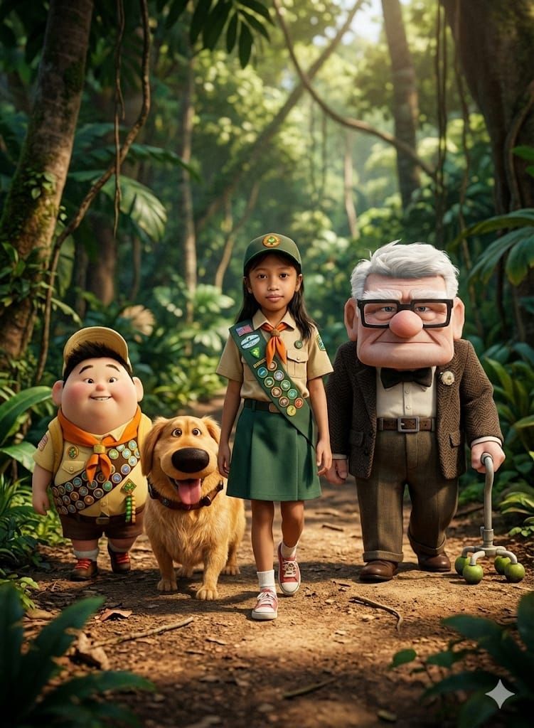 A cinematic, ultra-detailed, and hyper-realistic editorial-quality photograph. A realistic young girl (based on the attached image) dressed in a classic Girl Scout uniform, walking casually alongside three original 3D rendered Pixar-style characters from the 2009 animated film Up: Russell, Dug, and Carl Fredricksen. Focus on the original design texture details of the characters' skin, hair, fur, and clothing. The scene takes place on the jungle trail from the movie. Natural ambient lighting. Centered composition. Kodak Vision3 ISO 400 color grading