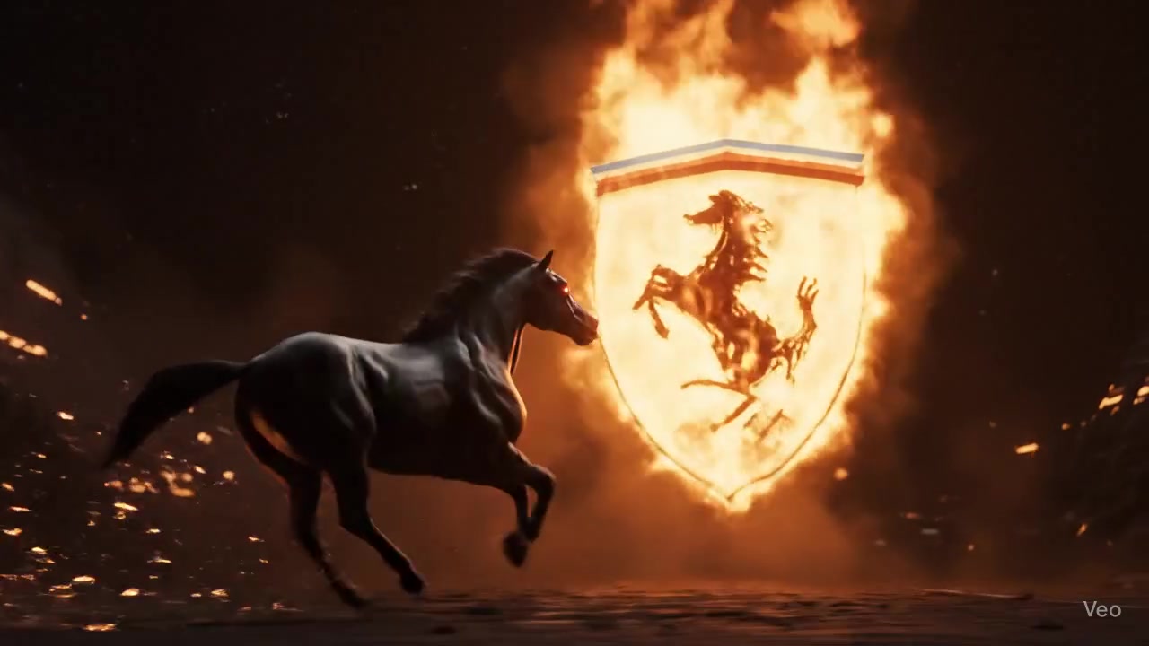 { “description”: “A dramatic cinematic scene where a powerful black horse gallops at high speed in a smoky, fire-lit environment. Suspended ahead is a massive Ferrari logo engulfed in flames. As the horse charges forward, sparks trail behind its hooves. It leaps through the burning logo, triggering a fiery metamorphosis mid-air. In a burst of energy and flame, the horse transforms into a sleek red Ferrari sports car. The newly-formed car lands smoothly and accelerates directly toward thecamera at high speed, with motion blur and fiery trails.”, “style”: “cinematic”, “camera”: “dynamic tracking shot ending in rapid frontal zoom as car approaches”, “lighting”: “intense with fire glow, smoke diffusion, and high-contrast reflections”, “elements”: [ “realistic black horse with glowing red eyes and ember sparks from hooves”, “burning floating Ferrari logo (3D with realistic fire and heat distortion)”, “flaming transformation effect mid-air”,”sleek red Ferrari car with chrome highlights”, “fiery tire trails and road heat shimmer”, “background of dark abstract or futuristic environment”, “camera lens flare from headlights” ], “motion”: “black horse gallops fast, leaps through flaming logo, transforms into Ferrari, which speeds rapidly toward the camera”, “ending”: “Ferrari approaches the lens at full speed, screen fills with headlights and motion blur”, “text”: “none”, “keywords”: [“16:9”, “cinematic”, “horse to car transformation”, “Ferrari logo”, “fire effects”, “speed toward camera”, “epic action”, “no text” ]}