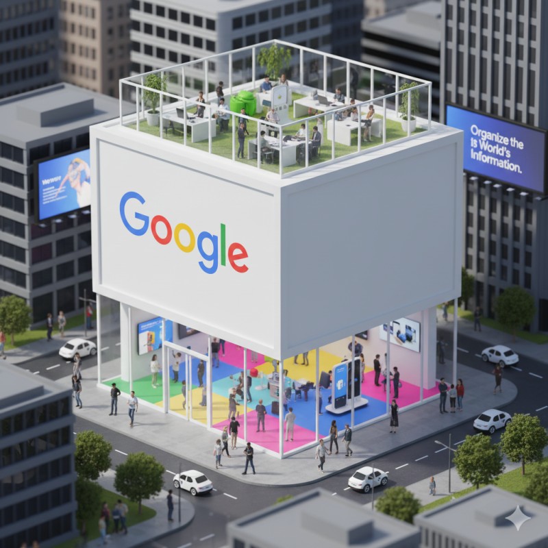 3D rendering, miniature architectural photography style, main structure is a colossal Google branded server/data center equipment box building, featuring white rectangular shipping box with colorful "Google" logo in signature colors (blue, red, yellow, green). Two-story building design: ground floor has glass entrance doors at box front, multicolored promotional display area, and tech innovation lab with people testing Pixel phones inside. Interior shows abundant Google product displays, Android demo stations and AI assistant interactions. Second floor includes transparent windows and rooftop creative workspace with people using Chromebooks and collaborating. Surrounding urban environment shows Silicon Valley aesthetic, tech workers walking with coffee, and self-driving Waymo cars. Innovative and playful atmosphere emphasizing organizing world's information, showcasing Google's brand identity in technology services sector. High-quality 3D rendering, detailed miniature style, vibrant commercial photography aesthetic