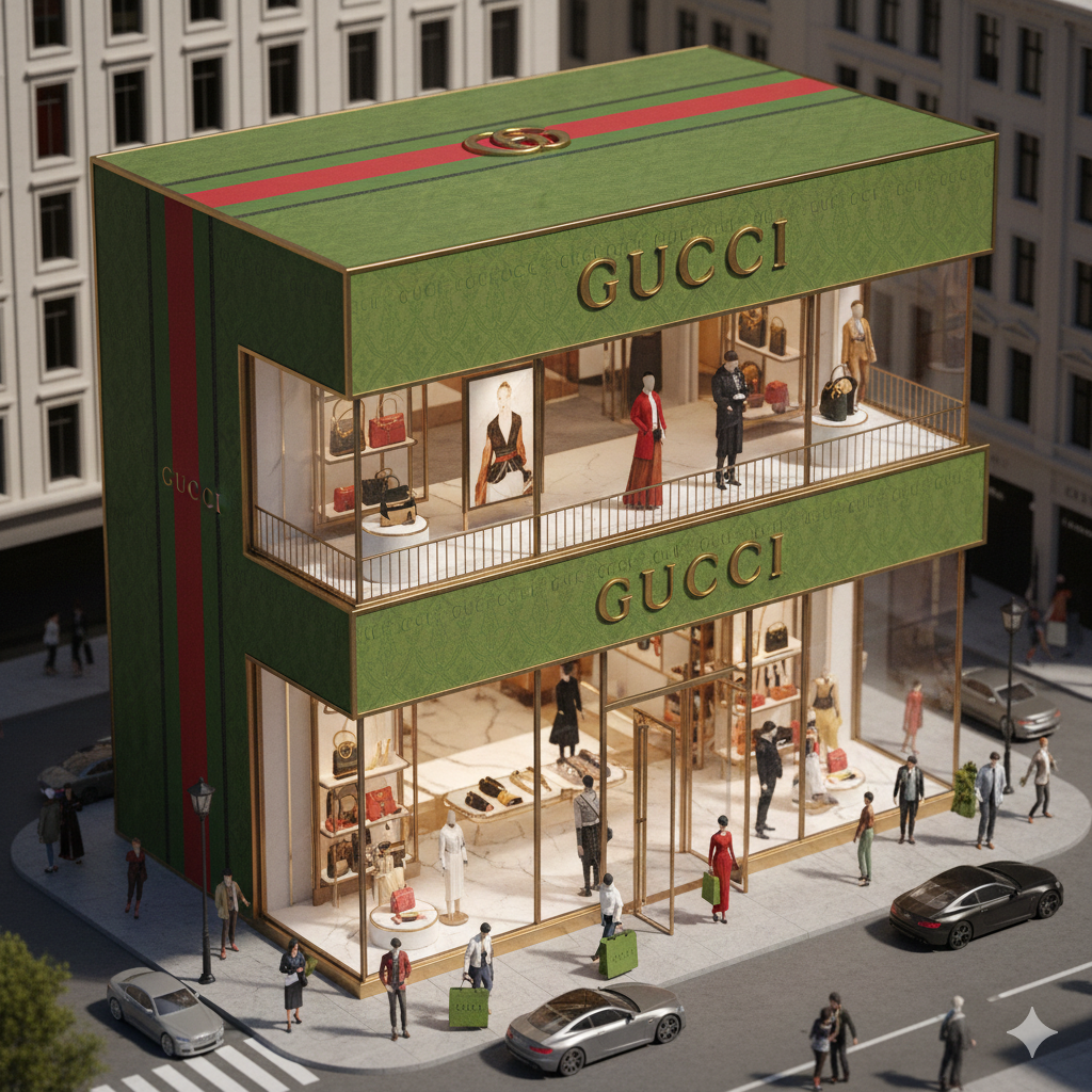 3D rendering, miniature architectural photography style, main structure is a colossal Gucci branded shopping box building, featuring signature green and red striped box with gold "GUCCI" logo and luxury packaging details. Two-story building design: ground floor has glass entrance doors at box front, opulent promotional display area, and designer fashion displays with high-end customers browsing inside. Interior shows abundant handbags, ready-to-wear collections and iconic double-G accessories. Second floor includes transparent windows and striped balcony with people exploring luxury goods. Surrounding urban environment shows high fashion districts, stylish shoppers carrying green shopping bags, and luxury cars. Extravagant and fashion-forward atmosphere emphasizing Italian luxury, showcasing Gucci's brand identity in luxury fashion sector. High-quality 3D rendering, detailed miniature style, vibrant commercial photography aesthetic