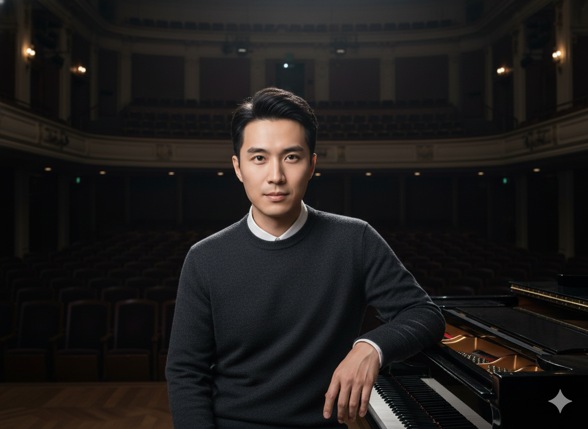 A hyper detailed cinematic scene featuring use uploaded face 100% as reference as the unblinking eye. The camera captures the hero in the center of the frame with absolute clarity and dramatic presence. Dressed in a dark, simple cashmere sweater, its soft, luxurious texture visible, over a collared shirt. He is leaning against a dark, polished grand piano in an empty, dimly lit concert hall, the black keys reflecting the sparse light with a subtle gleam. The vast, empty space emphasizes his solitary, powerful presence. The heavy atmosphere is one of quiet contemplation and immense control. Use language inspired by premium photography and expert level photo manipulation techniques similar to high end Photoshop to achieve top quality realism without CGI or 3D graphics. Create a one of a kind, unforgettable scene with unmatched detail, cinematic power, and full focus on the hero. no CGI or 3D graphics or art. use Photoshop manipulation if the scene illogical and imaginary.
