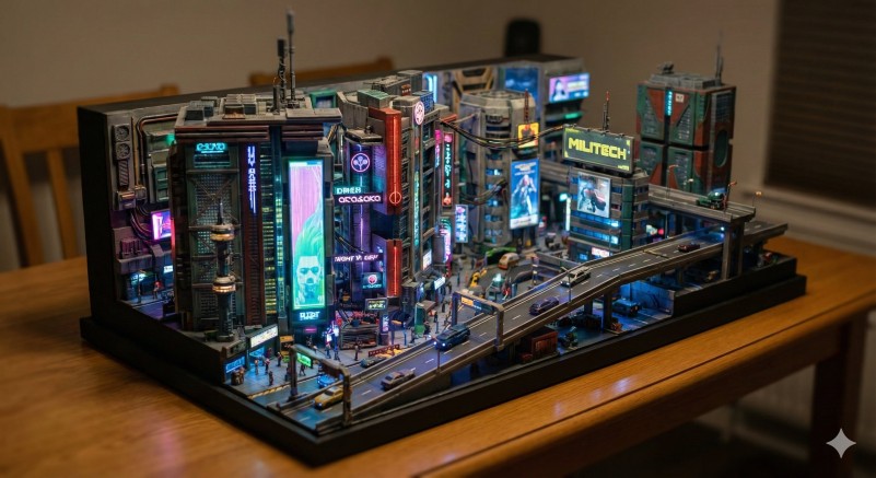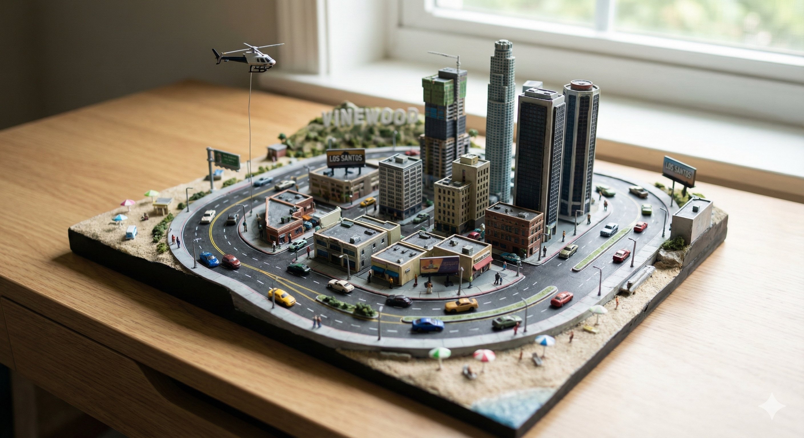 A miniature tabletop version of the iconic map from [VIDEO GAME 1PUBG Mobile (Erangle Map) 2GTA V (Los Santos) 3Minecraft (Overworld) 4Cyberpunk 277 (Night City) ], with tiny characters, vehicles, terrain, and interactive-looking details. Stylized realism, soft lighting, tilt-shift depth.