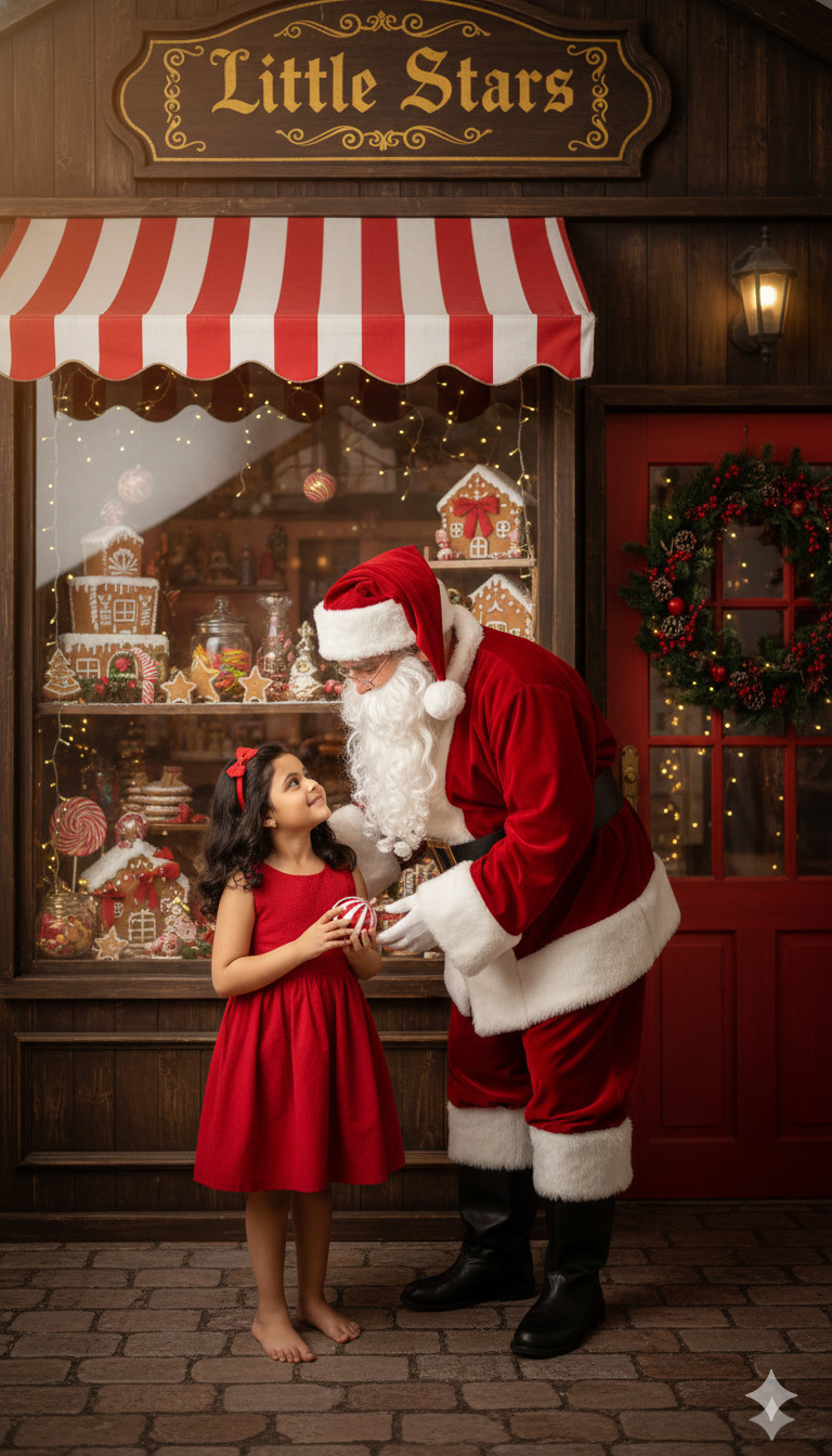 Create an 8k ultra-realistic zoomed-in photo of a girl from the attached Photo in a A cozy indoor Christmas scene featuring a traditional Santa Claus and girl from the attached Photo in a red dress standing in front of an old-fashioned gingerbread bakery storefront, warm festive lighting, ultra detailed, 8k, studio photography.Full body view of Santa in a classic deep red velvet suit with thick white fur trim, black belt and boots, long white beard, soft diffused lighting on his face, gently bending down toward the girl as if talking kindly, natural pose, soft smile, wears a simple elegant red dress matching mini headband with small bow, bare feet, holding a small red-and-white Christmas ornament or gift in her hands, looking up toward Santa, candid posture, soft rim light along her hair and shoulders, subtle motion in the dress fabric.Background styled as a vintage European gingerbread bakery shop: dark wooden facade, signboard at the top reading “Little Stars ” in gold lettering with ornate scrollwork, striped red and white awning, brick wall texture above, rich warm color palette of reds, browns, and golds.Large shop window filled with Christmas treats and decorations: stacked gingerbread houses, candy jars, lollipops, cookies, small toys and trinkets, fairy lights reflected in the glass, strong depth and layering of props to create a storybook feeling.Right side of the background showing a red door surrounded by lush green garlands with red berries, pinecones, and fairy lights, subtle glow from a vintage wall lantern.Foreground floor made of worn cobblestone or textured studio floor, slightly dark and vignetted toward the corners to keep focus on Santa and the child, gentle shadows for realism.Color grading: warm, rich tones; high contrast yet soft highlights; cinematic Christmas ambiance, bokeh from tiny lights in the background, no harsh reflections.Camera: straight-on eye-level angle, slight wide framing to capture the full storefront and both subjects head to toe; shallow to medium depth of field keeping Santa and child tack sharp while background elements are softly detailed.Style: whimsical holiday portrait, magical Christmas atmosphere, professional studio lighting, highly detailed fabrics and textures