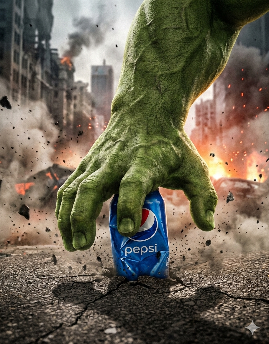 "concise_prompt": "Hulk's giant hand hovering over a crushed Pepsi can embedded in pavement, smoky ruins, explosive action movie style. --ar 7:9"