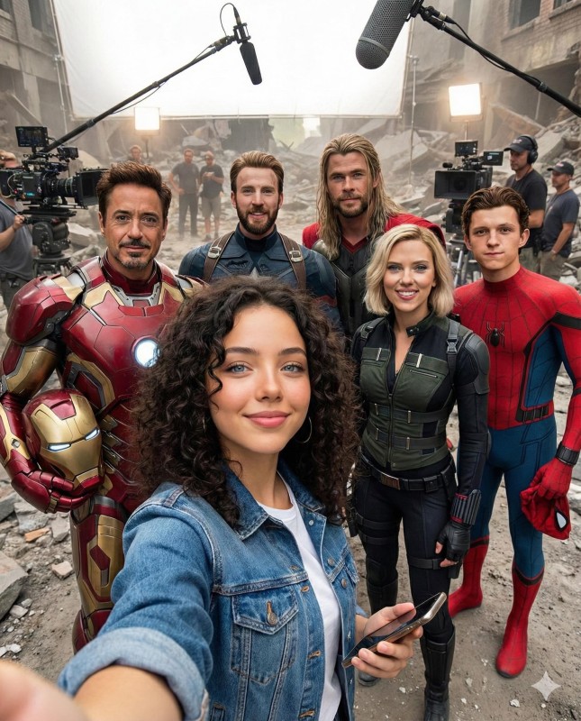 Create a hyper-realistic cinematic image that represents an authentic behind-the-scenes moment during a break in the filming of an epic scene. The image must clearly show the coexistence between fiction and reality, like a selfie taken between takes.