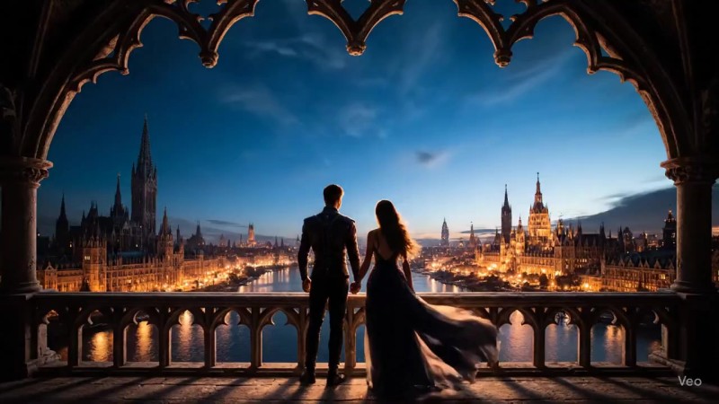 "description": "The scene opens on a wide shot from behind a couple standing on an ornate stone balcony. They are looking out over a sprawling city at late dusk. The city is alive with thousands of warm, glowing lights. The sound is a gentle, ambient breeze mixed with a faint, distant city hum."
