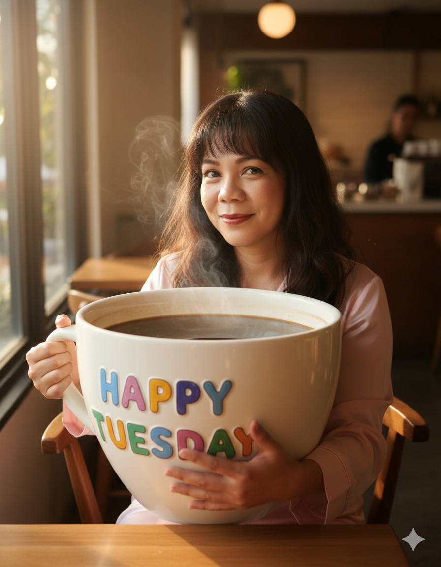 Ultra-realistic cinematic photograph of a beautiful woman casually drinking coffee, holding an oversized GIANT coffee cup (extra-large, exaggerated scale, almost as big as her torso),with bubble fonts saying HAPPY TUESDAY,both hands wrapped around the massive mug, visible steam rising, cozy café or aesthetic indoor setting, morning sunlight through large windows, dramatic scale contrast between the woman and the giant cup, realistic weight, natural skin texture,hair is long and wavy, soft natural makeup, with cheerful expression while looking at the camera, wearing light pink silk stylish sleepwear, warm color tones, shallow depth of field, ultra-sharp focus on subject, realistic shadows and reflections on the giant ceramic mug, lifelike proportions, HDR, 85mm lens look, f/1.8, soft bokeh background, professional photography, hyper-detailed, photorealistic, 8K resolution, no cartoon, no illustration, no CGI, no blur, no distortion.