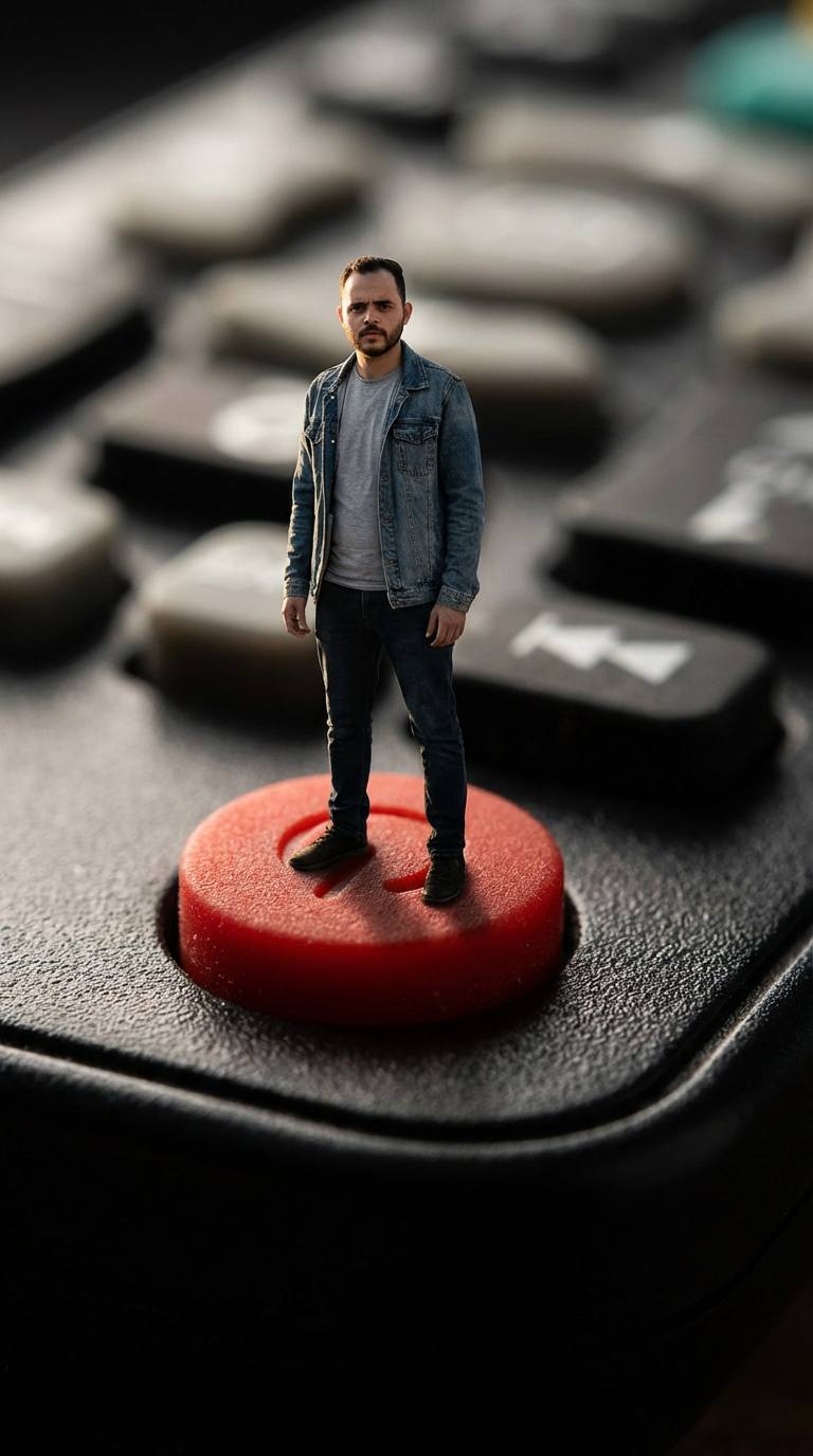A miniature man standing on a giant TV remote control power button, casual modern outfit, dramatic lighting, macro photography, ultra realistic textures, shallow depth of field, 5D realism