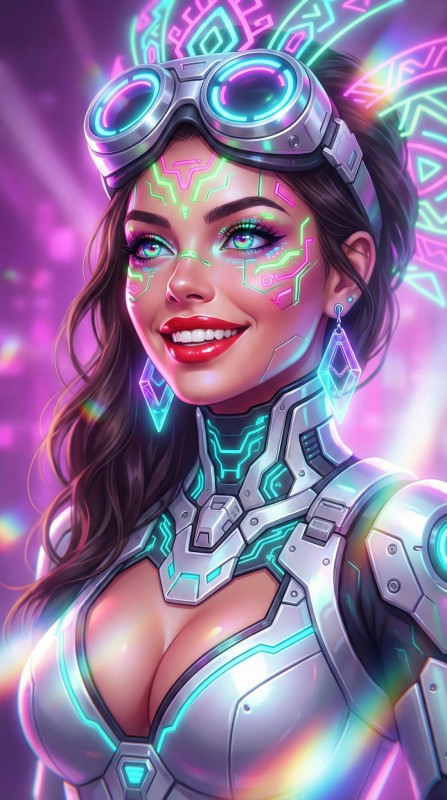 Glowing neon-green and pink "cyber-makeup" or tech-implants on her forehead and cheeks.