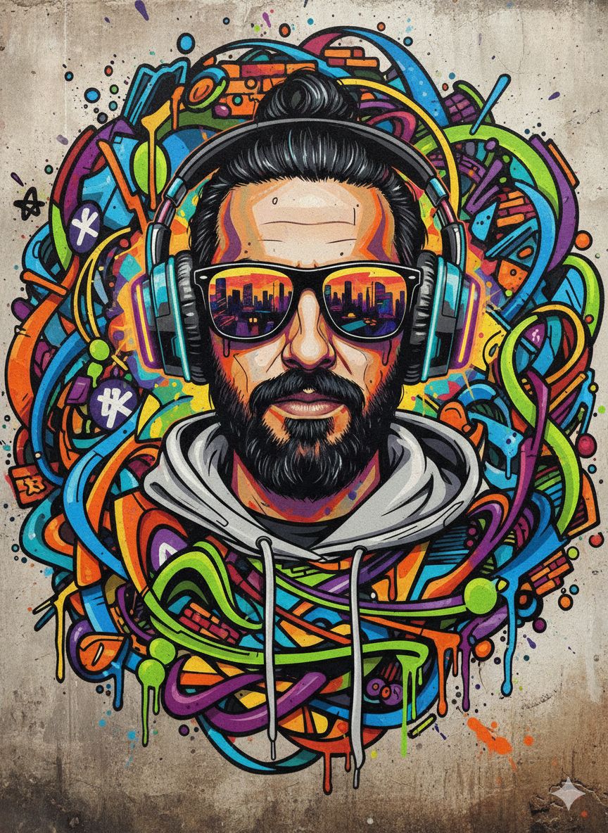 Edit the uploaded photo (face based on the reference photo) . make a professional graphic design grafitti in 8k , vertical orientation of a colorful man with shades with headphones abstract background.