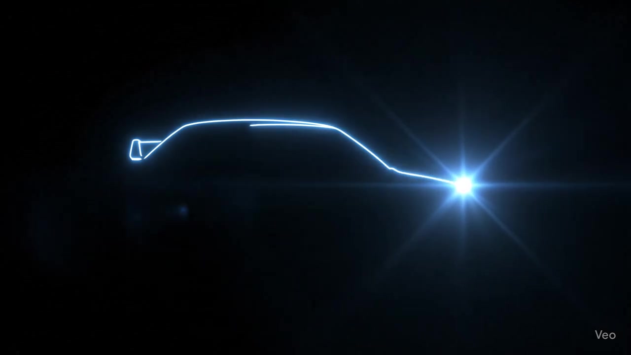 A cinematic, high-definition video of a single, brilliant star-like point of light appearing in the center of a dark, empty space. The light begins to move with purpose, leaving a vibrant, glowing trail behind it as it elegantly traces the iconic lines of a vehicle uploaded sports car in mid-air. The drawing process is fluid and quick, with the glowing lines defining the car's body, wheels, and headlights. Once the outline is complete, the light intensifies and flashes brightly, and in an instant, the ghostly glowing outline solidifies into a stunningly realistic, deep red Ferrari, perfectly detailed and gleaming in the light. The camera slowly pans around the now-solid car, highlighting its sleek curves and flawless finish