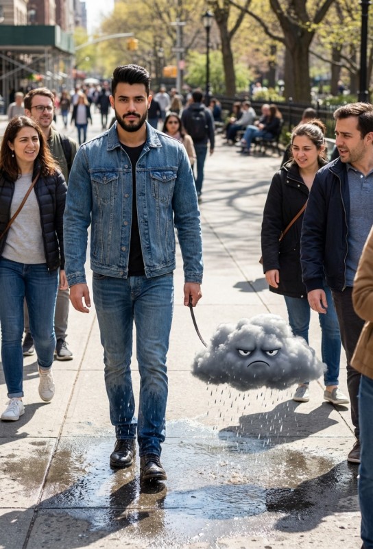 A quirky, cinematic street photography shot in a bustling city park on a sunny day. The casual male figure with uploaded face as reference is walking on a sidewalk, holding a leash. Attached to the leash is not a dog, but a small, grumpy-looking dark raincloud hovering at knee height. The cloud is raining exclusively on the subject's lower legs and shoes, while everywhere else is dry and sunny. Pedestrians walk by giving strange looks. The contrast between wet and dry pavement is sharp. Realistic rain effects and cloud texture.