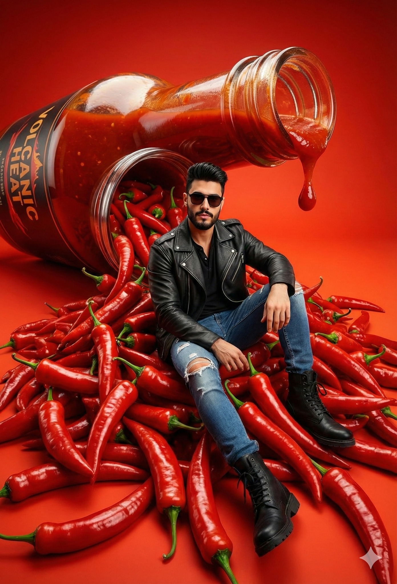 A hyper-realistic, 8k, highly detailed studio shot captured with a wide-angle lens from a slightly high-angle perspective, depicting a person sitting coolly atop a pile of giant, glossy red chili peppers spilling from a tipped-over oversized hot sauce bottle. The person, with uploaded face as reference, wears dark sunglasses, a black leather biker jacket, ripped jeans, and combat boots, appearing unfazed by the heat surrounding them. The peppers have a waxy, wrinkled texture, and a drop of thick red sauce hangs from the bottle's rim. The composition emphasizes the spicy, bold scale contrast. Cinematic lighting creates dramatic highlights on the shiny pepper skins, set against a seamless, fiery red background to enhance the intense, flavorful aesthetic.