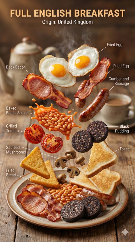 "labels": "Clear English text labels (e.g., 'Fried Egg', 'Back Bacon', 'Baked Beans Splash', 'Black Pudding')",