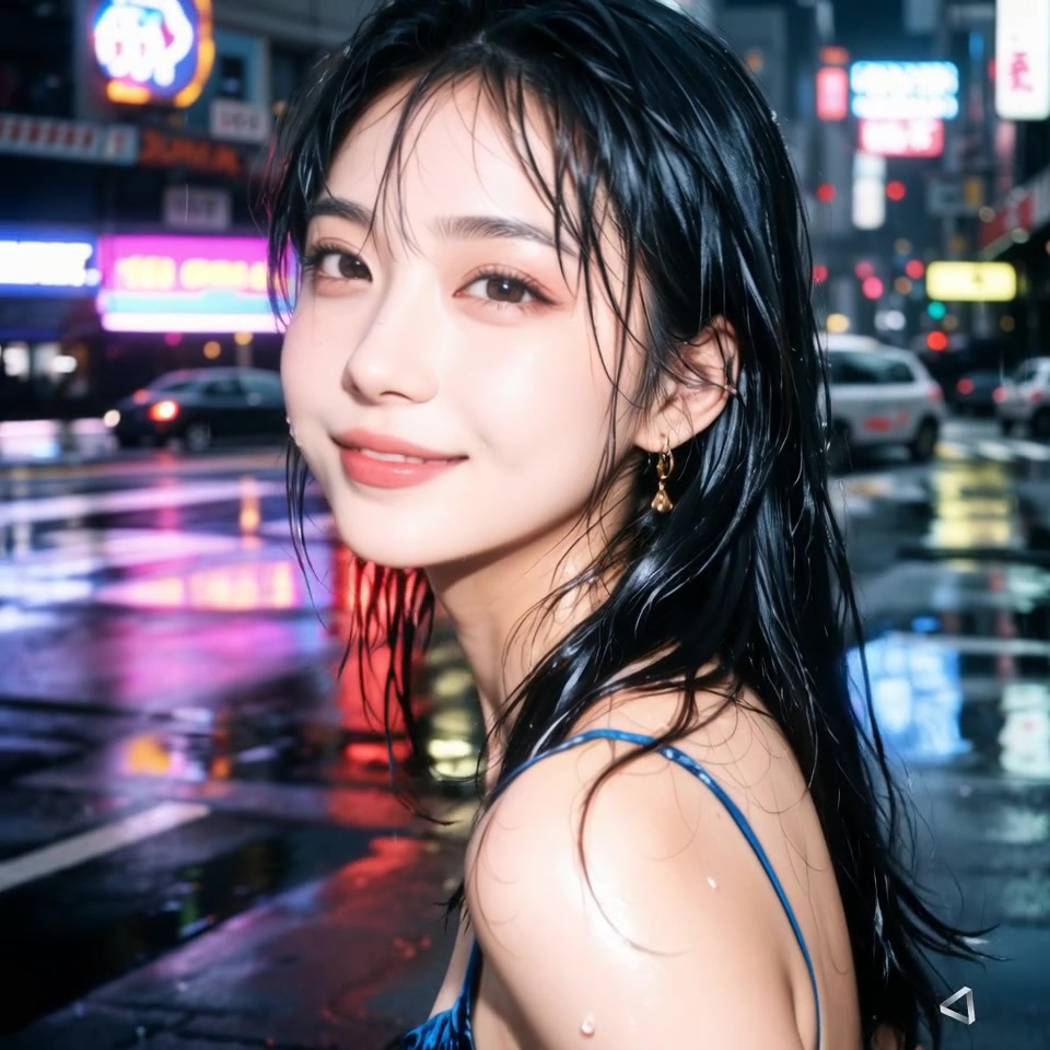 The camera zooms in to capture a close-up of a person. A young woman stands in the rain, her eyelashes quivering slightly, smiling in the direction of the camera, with water droplets sliding down from the tips of her hair.