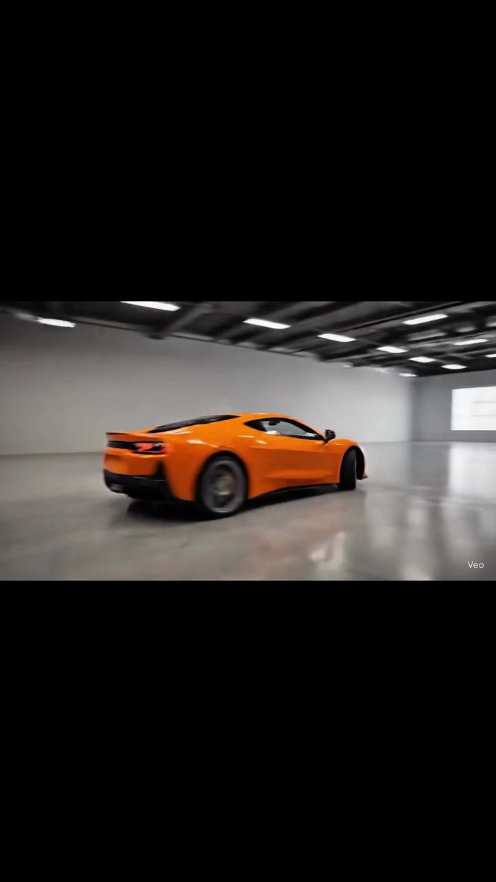 Ultra-realistic video of a sleek orange sports car parked motionless at the exact center of a vast, empty indoor garage. The garage has smooth, matte grey concrete walls and a polished floor reflecting soft light from bright overhead fixtures. The space is clean, minimalistic, and expansive, with no clutter. The camera performs a fast-paced orbit around the car, using speed ramping for dynamic acceleration and deceleration, circling the vehicle from all sides while keeping it perfectly