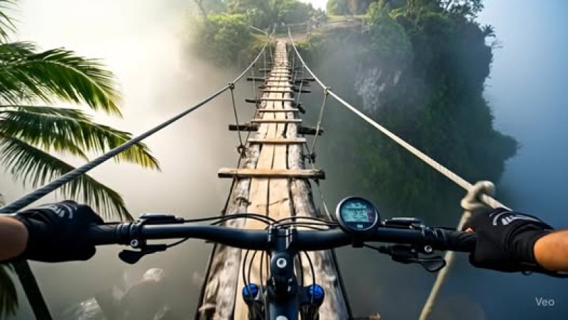 A cyclist's POV on a wooden suspension bridge over a misty ravine. Tense music accompanies each pedal stroke. The bridge's wood creaks loudly, the suspension ropes sway in the wind. The camera shakes slightly following the direction of the handlebars. Rider's dialogue (anxious, breathless): 'Oh my God... don't break, don't break...' 'Just a little bit more... hold on... let's do it!' As the bike's wheels reach the other side, the tense music slowly subsides, replaced by a sense of relief. The camera pans back briefly, revealing the bridge swaying in the mist.